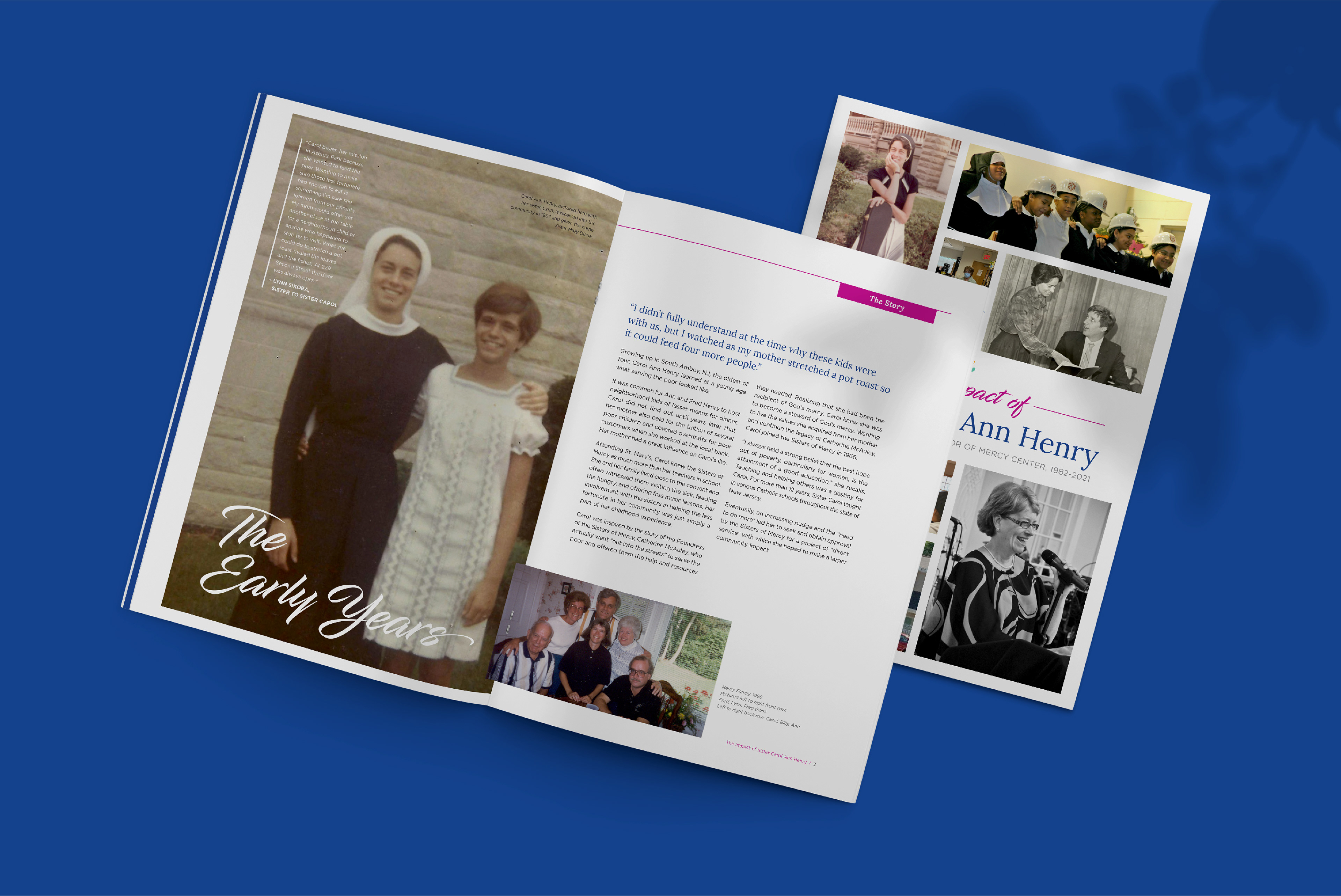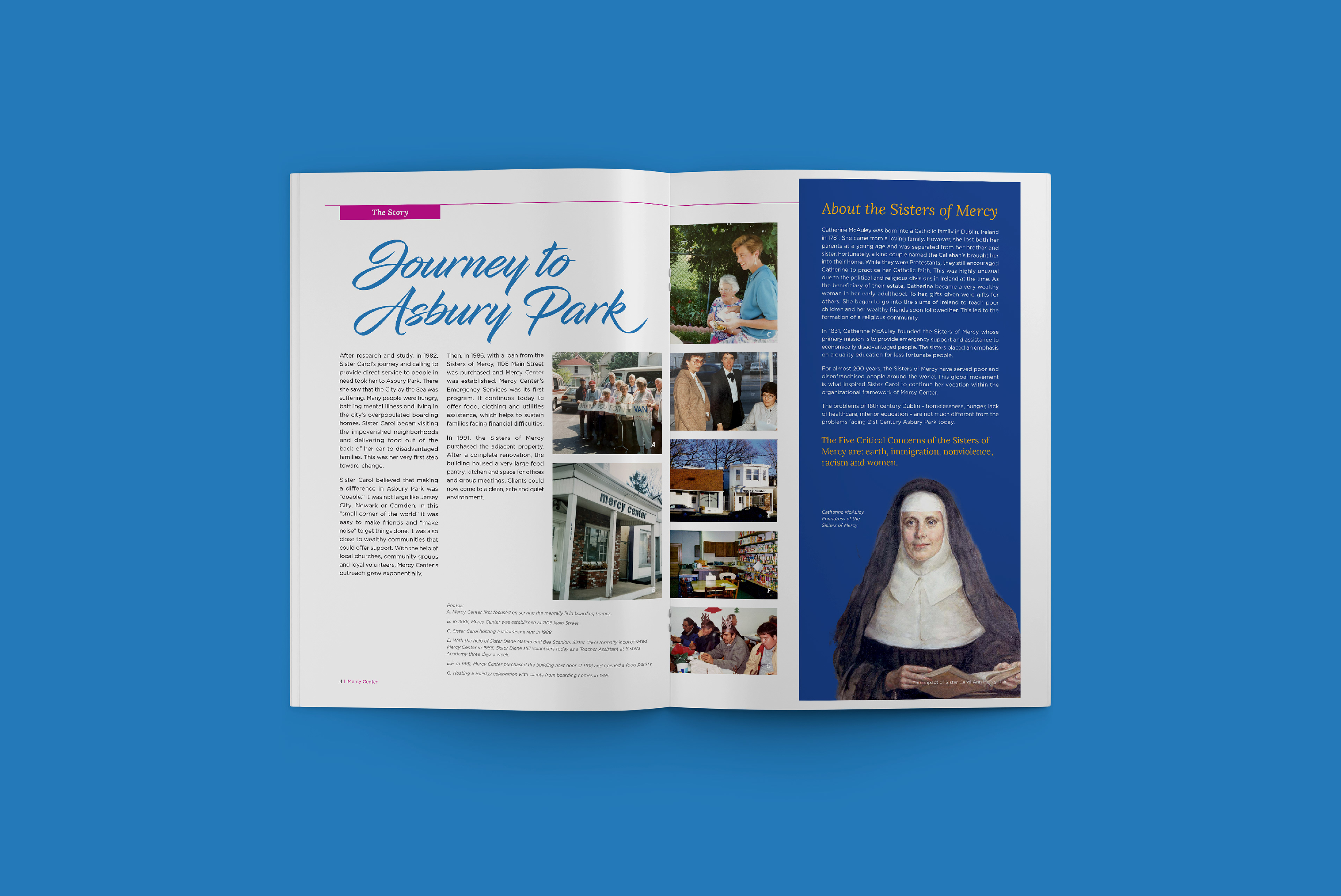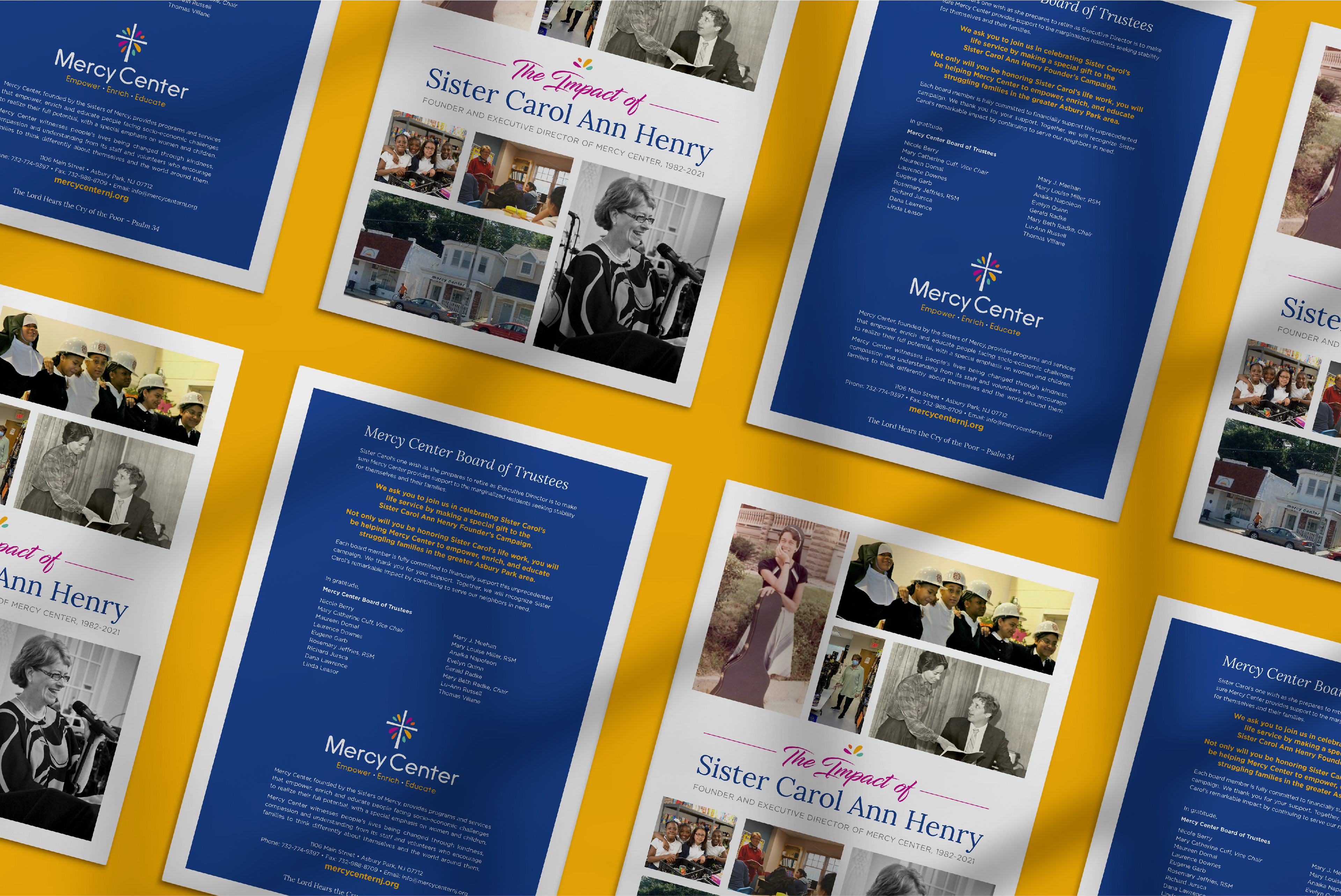 A magazine publication and mailing suite celebrating the lifelong accomplishments of Sister Carol Ann Henry at Mercy Center, which provides programs and services to people facing socio-economic challenges in Asbury Park.