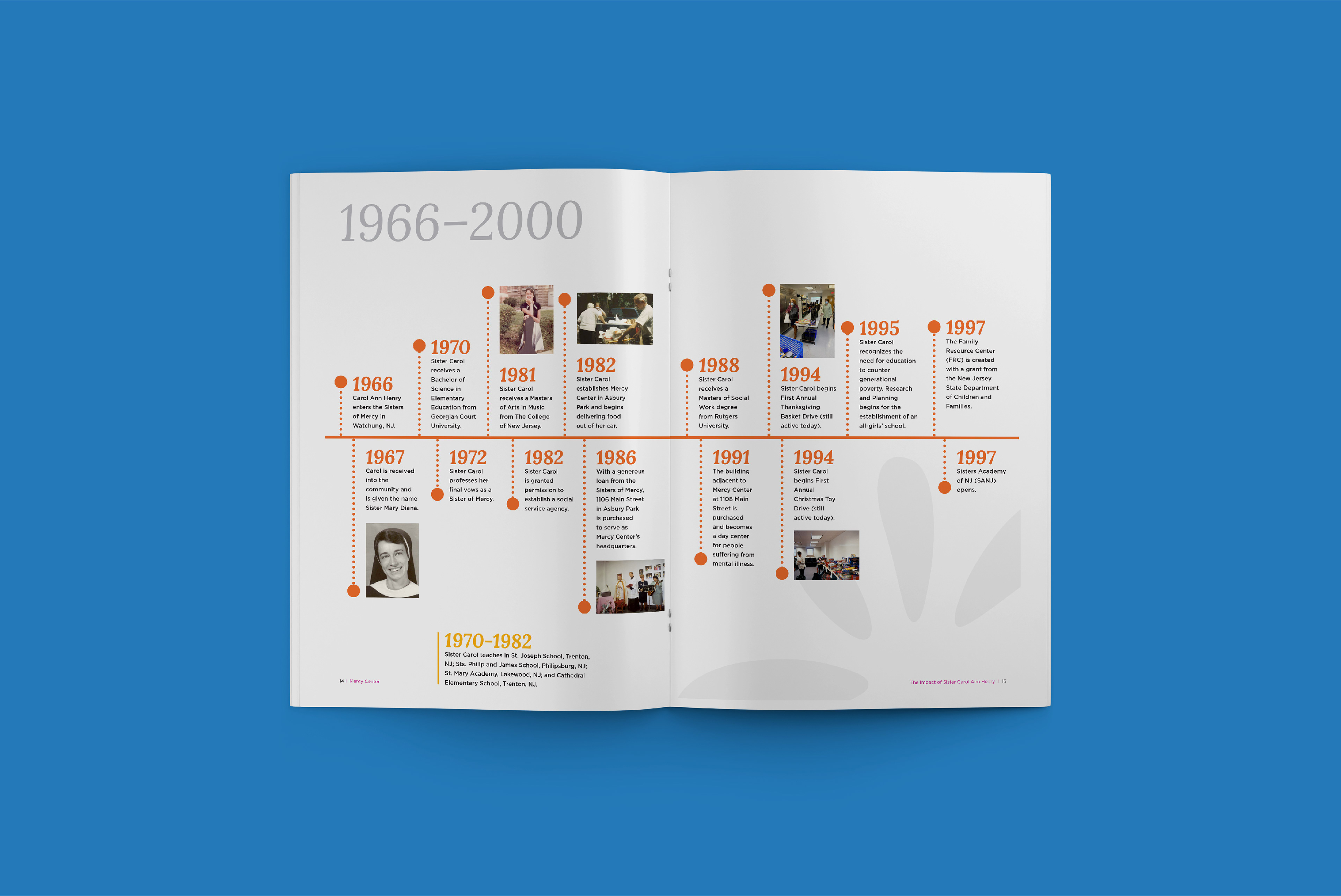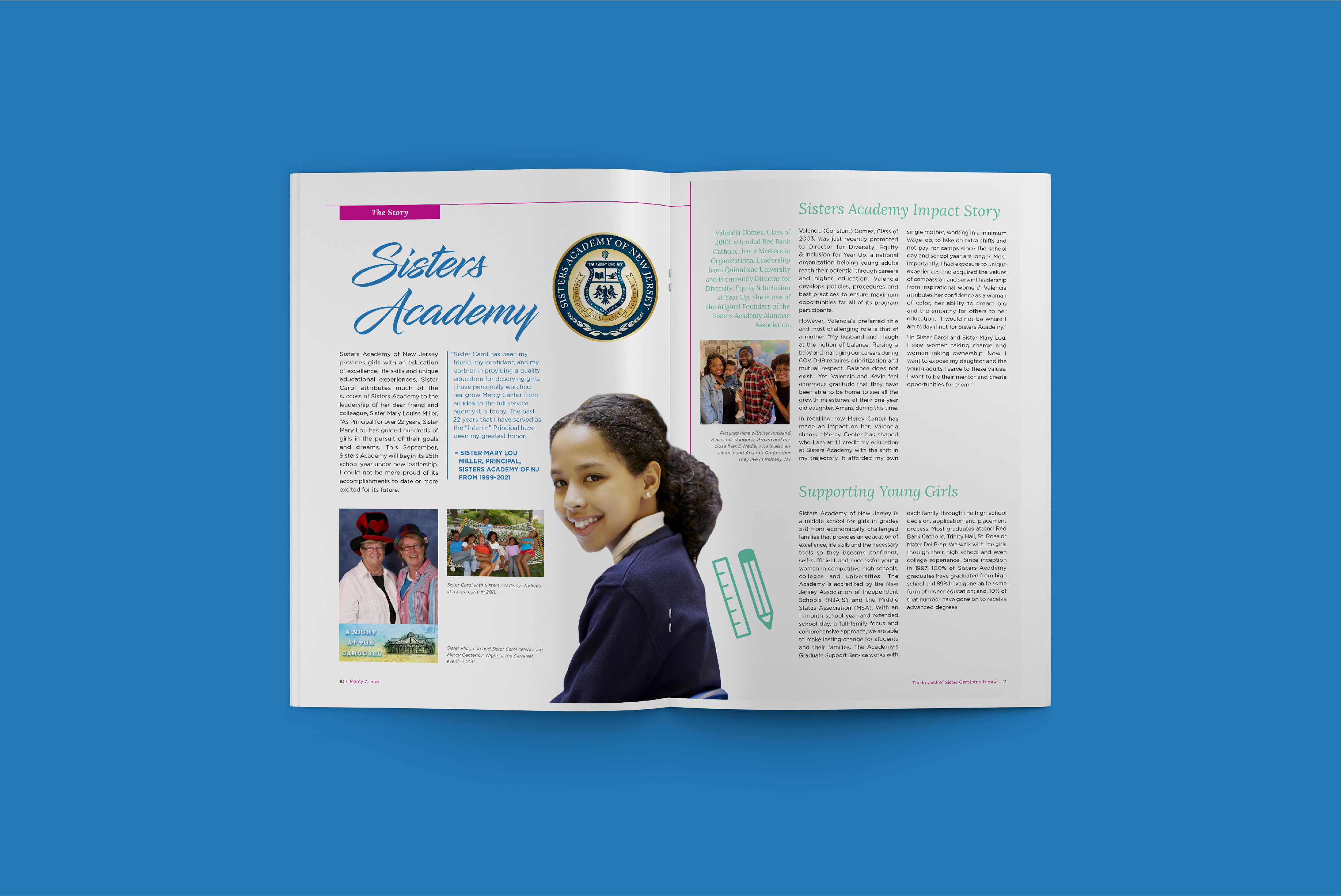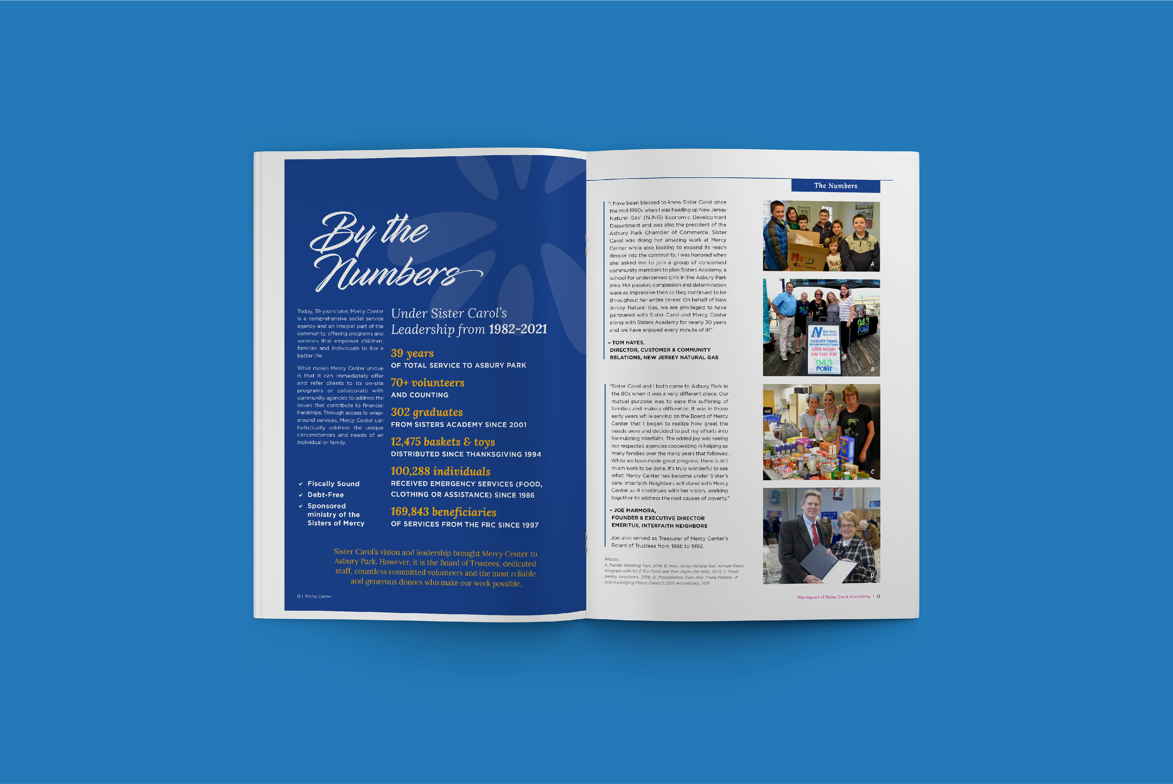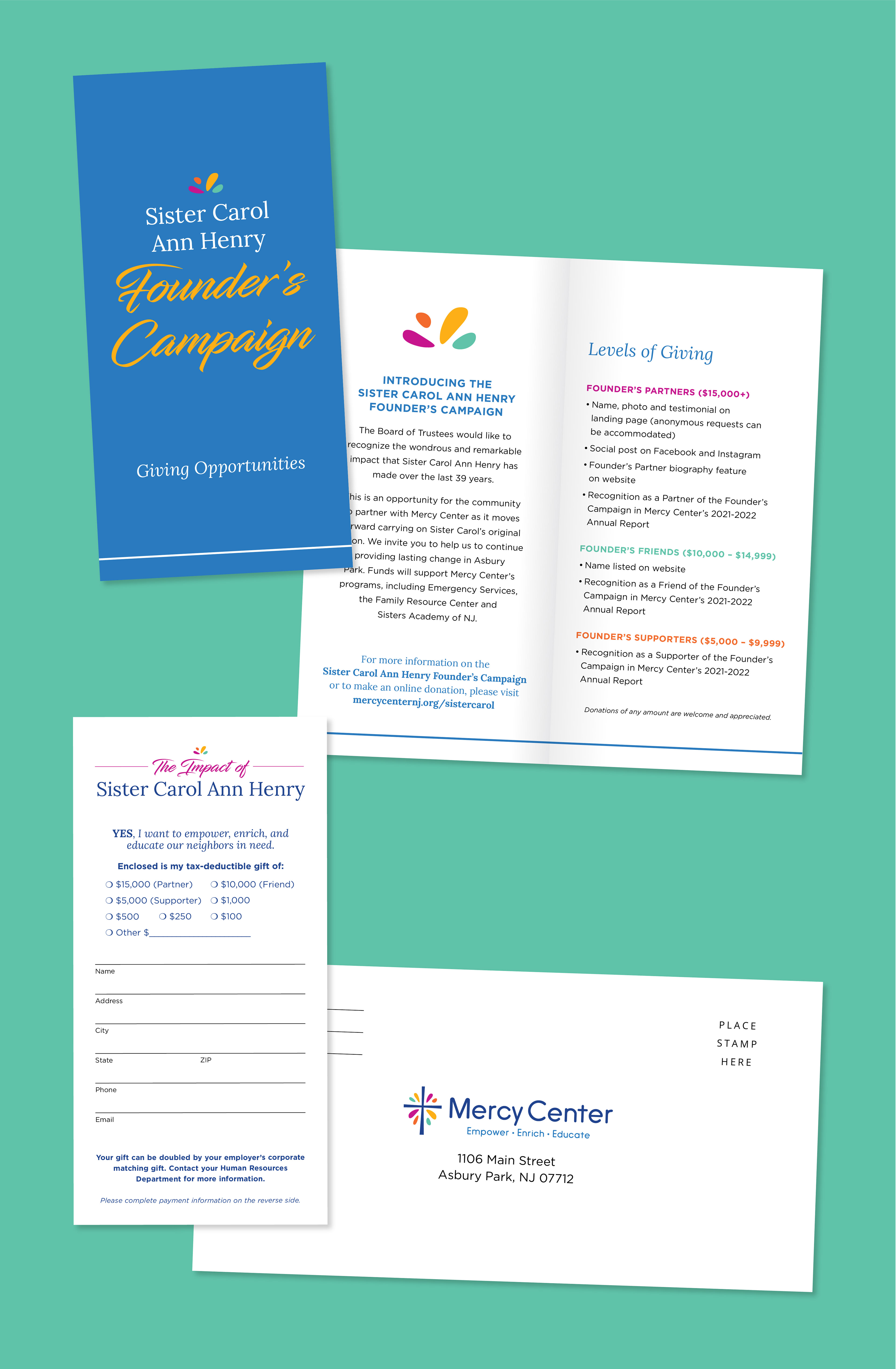A magazine publication and mailing suite celebrating the lifelong accomplishments of Sister Carol Ann Henry at Mercy Center, which provides programs and services to people facing socio-economic challenges in Asbury Park.